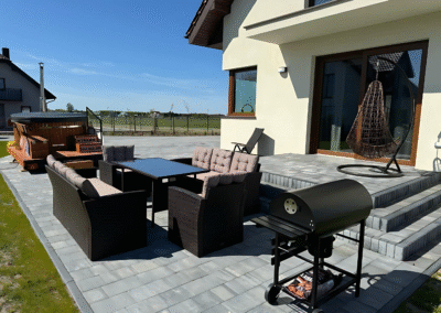 Przestrzeń do wspólnego grillowania wyposażona w nowoczesny grill, wygodne meble ogrodowe oraz oświetlenie, idealna na wieczorne spotkania przy smacznym jedzeniu.